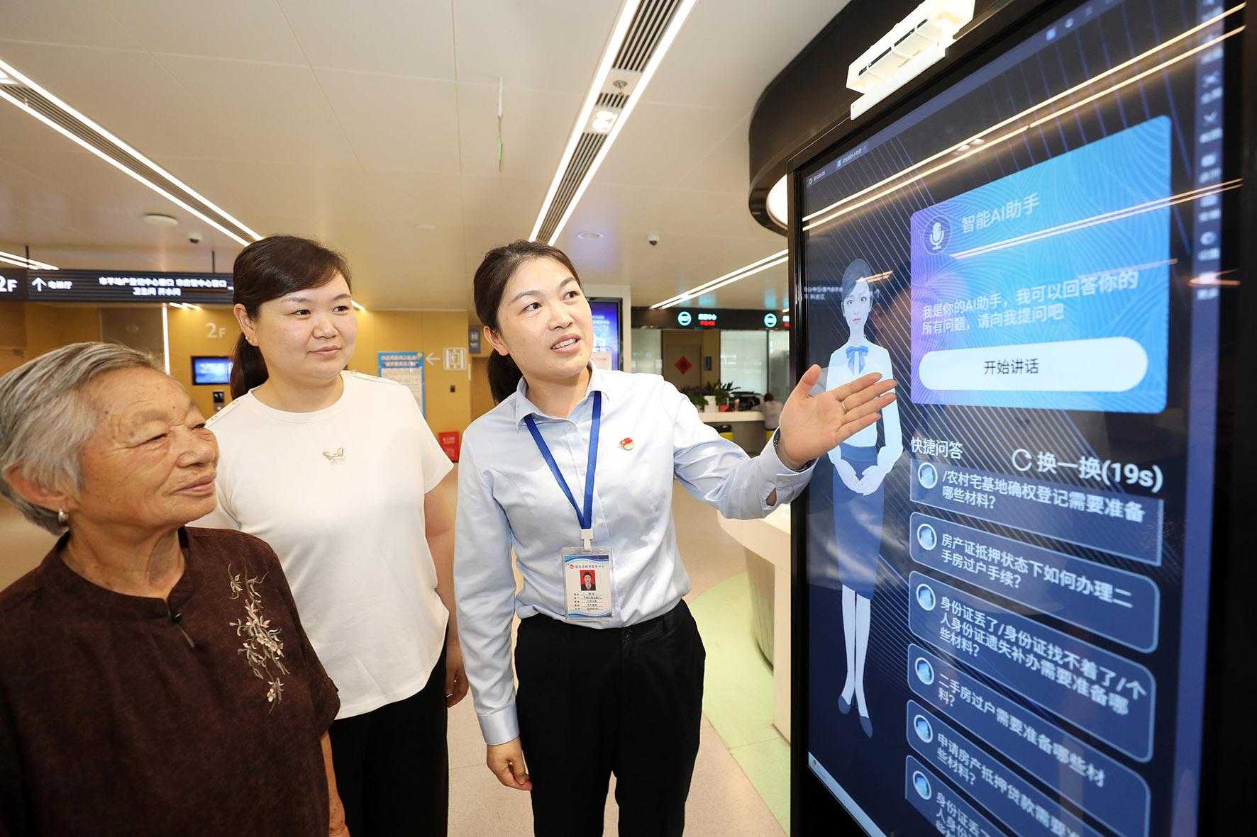 7月15日,安徽省淮北市政務服務大廳不動產(chǎn)登記窗口工作人員利用“智能AI助手”指導辦事群眾進行咨詢業(yè)務。當日,淮北市政務服務大廳不動產(chǎn)登記窗口“智能AI助手”投入使用,設備具有智能詢問解答導服功能,支持辦事群眾通過快捷、語音等多種方式進行交互。