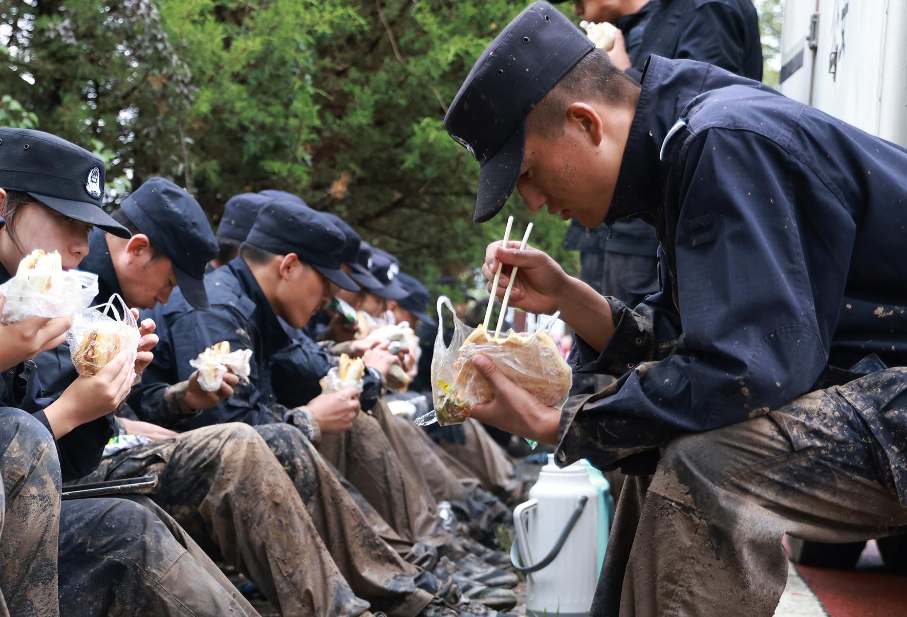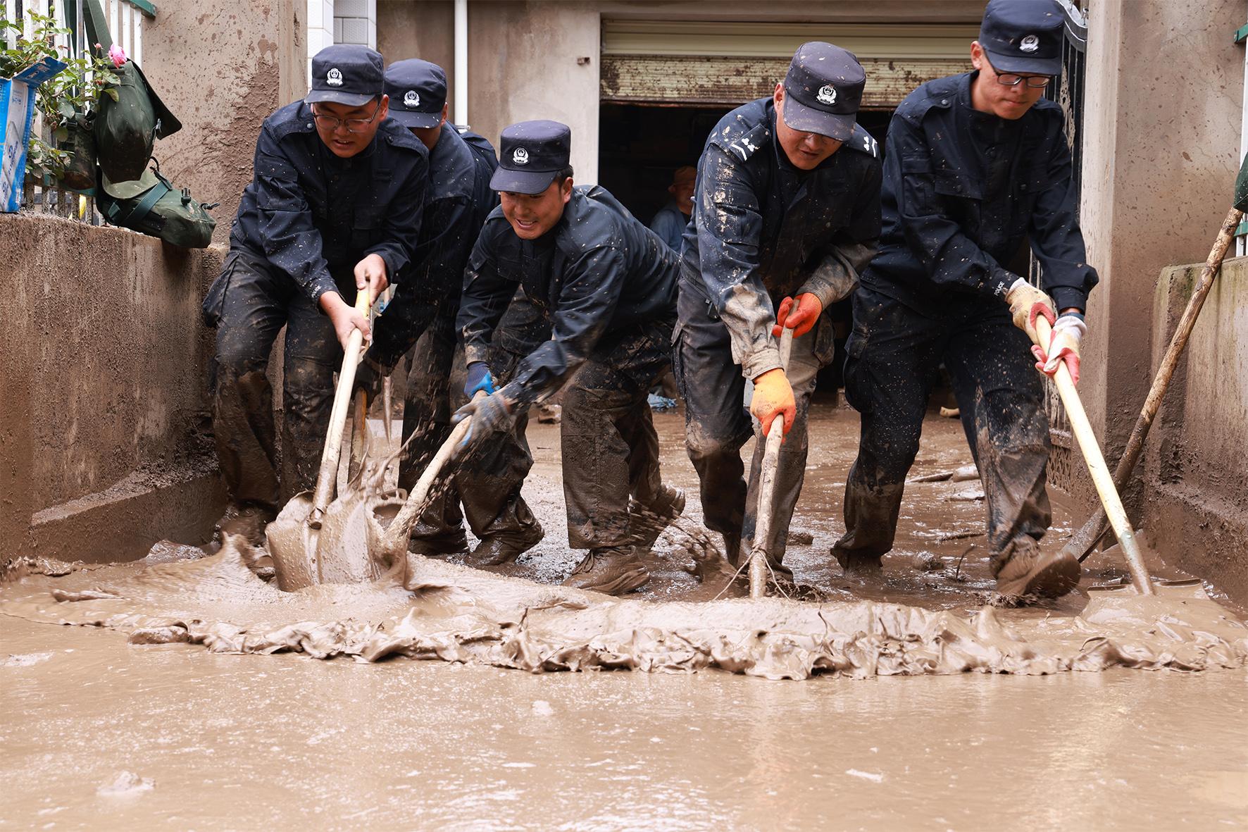 8月8日,甘肅省蘭州市公安局民警在甘肅省蘭州市榆中縣城關(guān)鎮(zhèn)興隆山村清理淤泥。8月7日至8日,榆中縣等地遭遇連續(xù)強(qiáng)降雨,引發(fā)山洪災(zāi)害,榆中縣城關(guān)鎮(zhèn)、馬坡鄉(xiāng)、小康營(yíng)鄉(xiāng)、夏官營(yíng)鎮(zhèn)等多個(gè)鄉(xiāng)鎮(zhèn)受災(zāi)。