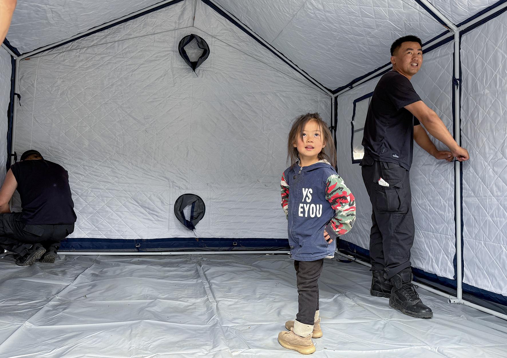 “叔叔來(lái)啦!”8月14日,在甘肅榆中縣新?tīng)I(yíng)鎮(zhèn)八門(mén)寺小泥窩村的公安指揮部帳篷里,一聲清脆稚嫩的呼喊打破了忙碌的氛圍,小女孩瑤瑤像一只歡快的小鳥(niǎo),一頭撲進(jìn)蘭州市公安局新區(qū)分局輔警蘇明凱、張?jiān)品宓膽牙铩?/p>