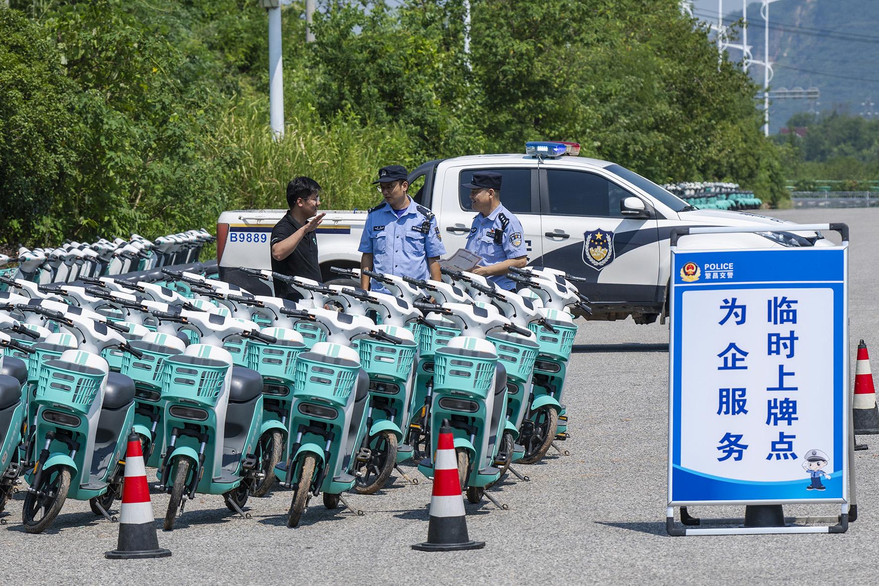 9月5日,安徽省蕪湖市公安局繁昌分局交通管理大隊(duì)車輛管理所民警在繁陽鎮(zhèn)為一家共享電動(dòng)自行車企業(yè)提供上門上牌服務(wù)。