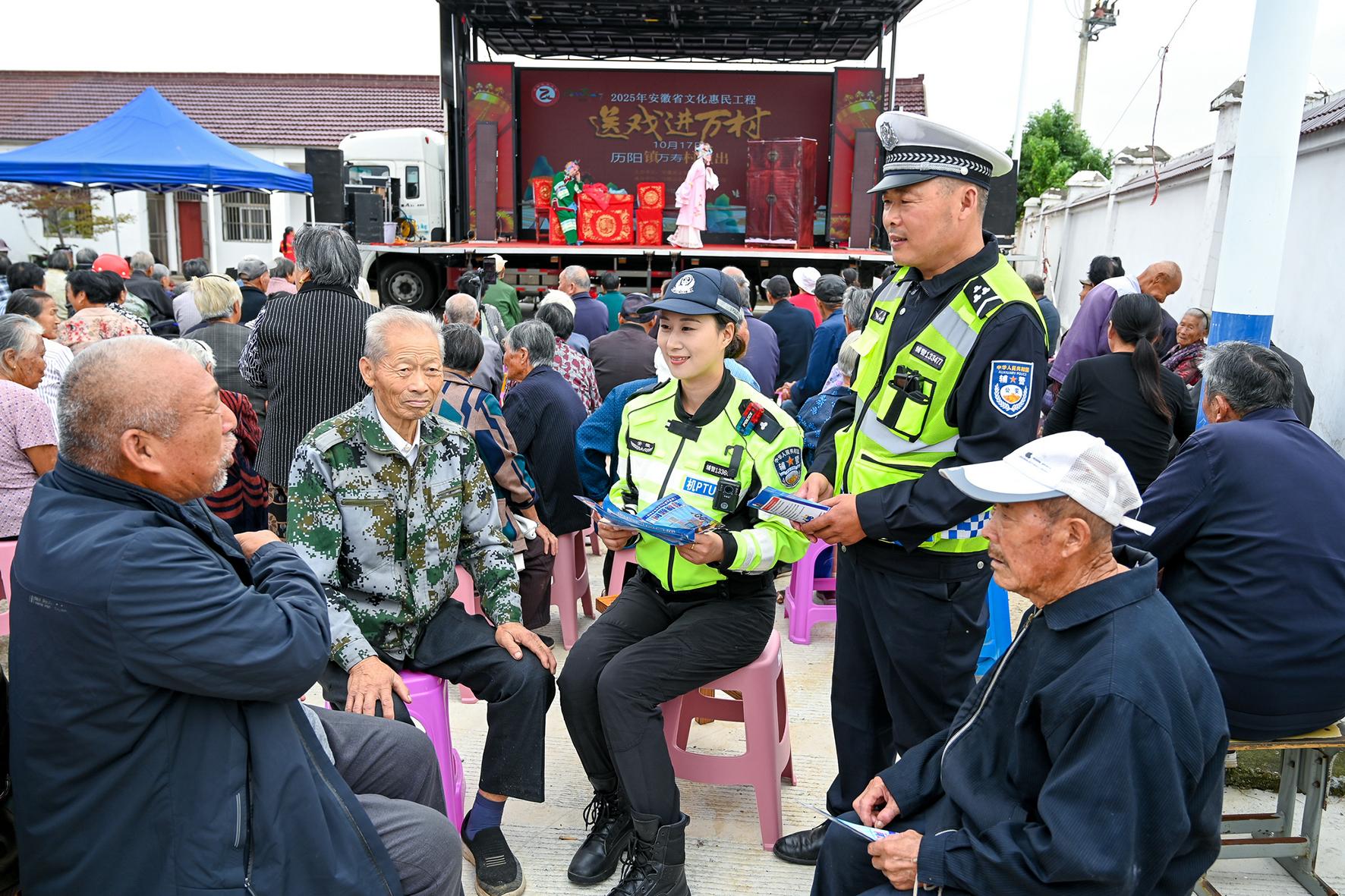 10月17日,安徽省馬鞍山市和縣公安局民警在歷陽(yáng)鎮(zhèn)萬(wàn)壽村“送戲下鄉(xiāng)”活動(dòng)現(xiàn)場(chǎng),向村民們開展交通安全知識(shí)宣傳。