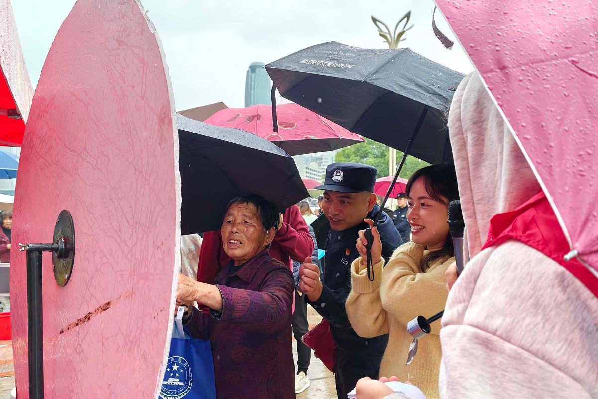 10月30日,浙江省臺(tái)州市公安局椒江分局府前派出所民警冒雨在市民廣場(chǎng)開(kāi)展反詐宣傳。
