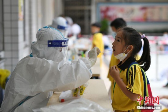 8月28日,學(xué)生在廣東省廣州市越秀區(qū)育才學(xué)校做核酸檢測。為進(jìn)一步做好中小學(xué)、幼兒園秋季學(xué)期開學(xué)新冠肺炎疫情防控工作,廣州多區(qū)開展全體師生員工核酸檢測。 中新社記者 陳楚紅 攝
