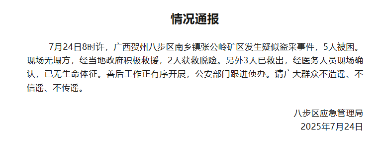 7月24日,廣西壯族自治區(qū)賀州市八步區(qū)應(yīng)急管理局發(fā)布情況通報(bào):7月24日8時(shí)許,八步區(qū)南鄉(xiāng)鎮(zhèn)張公嶺礦區(qū)發(fā)生疑似盜采事件,5人被困?,F(xiàn)場(chǎng)無塌方,經(jīng)當(dāng)?shù)卣e極救援,2人獲救脫險(xiǎn)。另外3人已救出,經(jīng)醫(yī)務(wù)人員現(xiàn)場(chǎng)確認(rèn),已無生命體征。善后工作正有序開展,公安部門跟進(jìn)偵辦。請(qǐng)廣大群眾不造謠、不信謠、不傳謠。