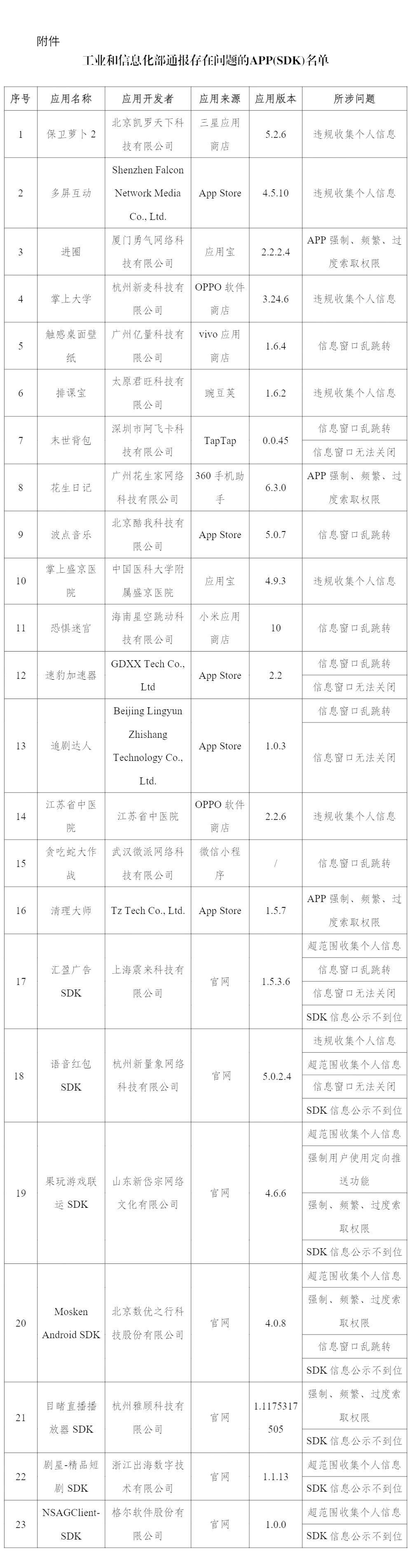 記者8月4日從工業(yè)和信息化部獲悉,依據(jù)相關(guān)法律法規(guī),工業(yè)和信息化部對APP、SDK(第三方軟件開發(fā)工具包)違法違規(guī)收集使用個人信息等問題開展治理。近期,經(jīng)組織第三方檢測機構(gòu)進行抽查,共發(fā)現(xiàn)23款APP及SDK存在侵害用戶權(quán)益行為。