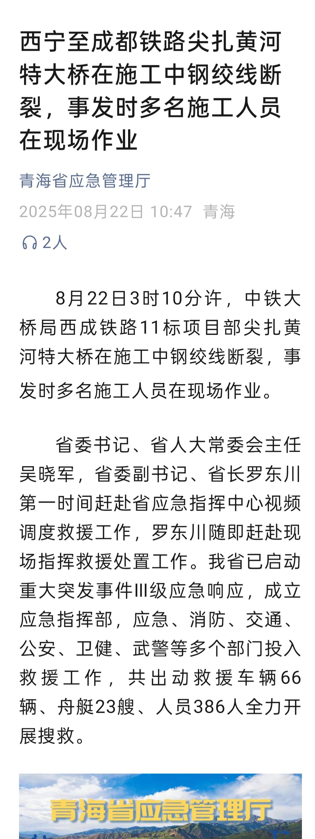 青海省應(yīng)急管理廳通報(bào)稱,8月22日3時(shí)10分許,中鐵大橋局西成鐵路11標(biāo)項(xiàng)目部尖扎黃河特大橋在施工中鋼絞線斷裂,事發(fā)時(shí)多名施工人員在現(xiàn)場(chǎng)作業(yè)。青海省委書(shū)記、省人大常委會(huì)主任吳曉軍,省委副書(shū)記、省長(zhǎng)羅東川第一時(shí)間趕赴省應(yīng)急指揮中心視頻調(diào)度救援工作,羅東川隨即趕赴現(xiàn)場(chǎng)指揮救援處置工作。青海省已啟動(dòng)重大突發(fā)事件Ⅲ級(jí)應(yīng)急響應(yīng),成立應(yīng)急指揮部,應(yīng)急、消防、交通、公安、衛(wèi)健、武警等多個(gè)部門投入救援工作,共出動(dòng)救援車輛66輛、舟艇23艘、人員386人全力開(kāi)展搜救。