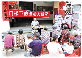 圖為張富成(中)在給村民們講解法律知識(shí)。