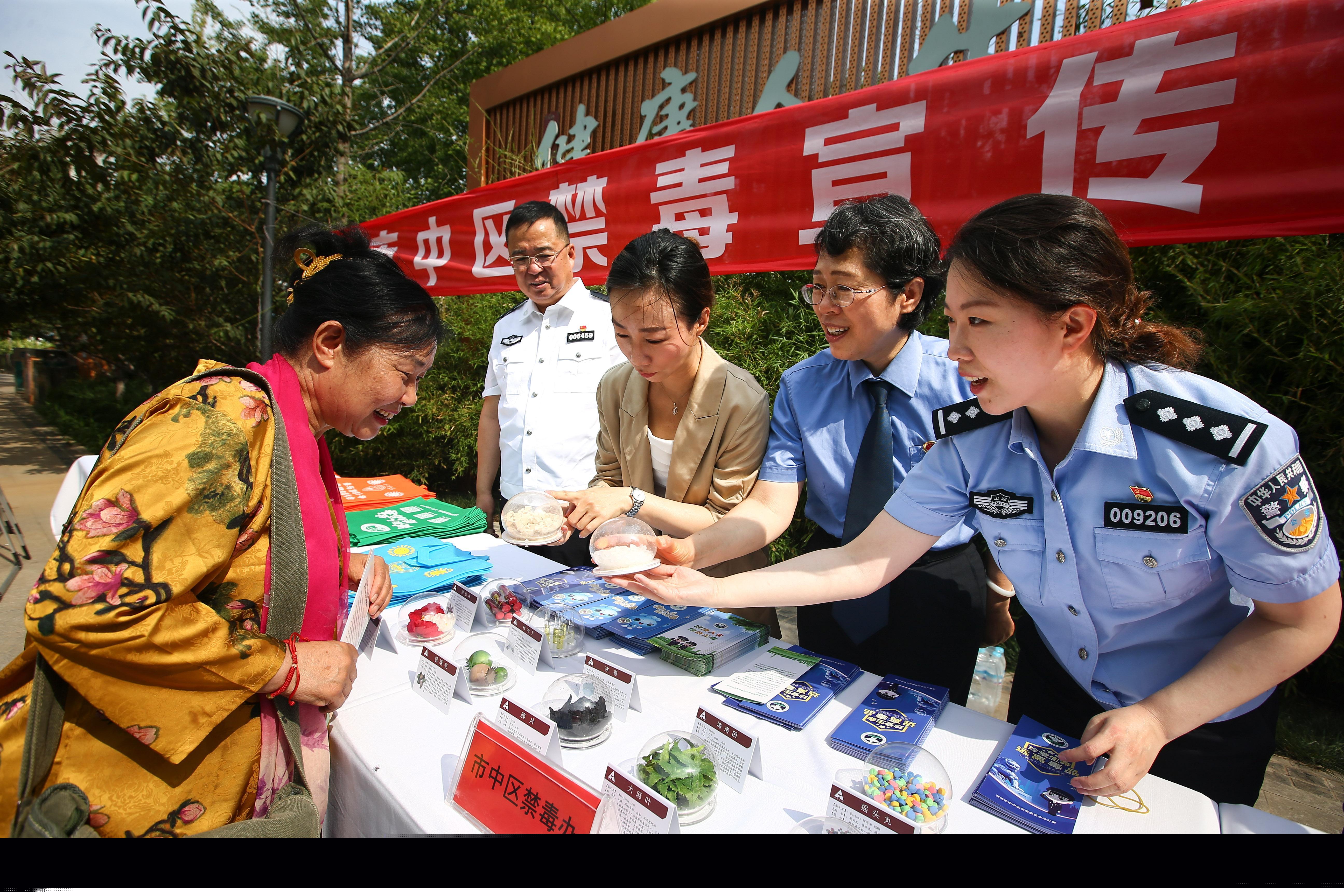 6月16日,山東省濟(jì)南市市中區(qū)禁毒辦聯(lián)合濟(jì)南市公安局市中區(qū)分局、市中區(qū)法院、市中區(qū)檢察院在轄區(qū)開展禁毒宣傳進(jìn)社區(qū)活動(dòng)。工作人員和志愿者通過(guò)設(shè)立宣傳展板,發(fā)放宣傳資料和展示仿真毒品模型等方式,向群眾普及禁毒知識(shí),提升群眾禁毒意識(shí)。圖為工作人員向群眾展示仿真毒品模型。