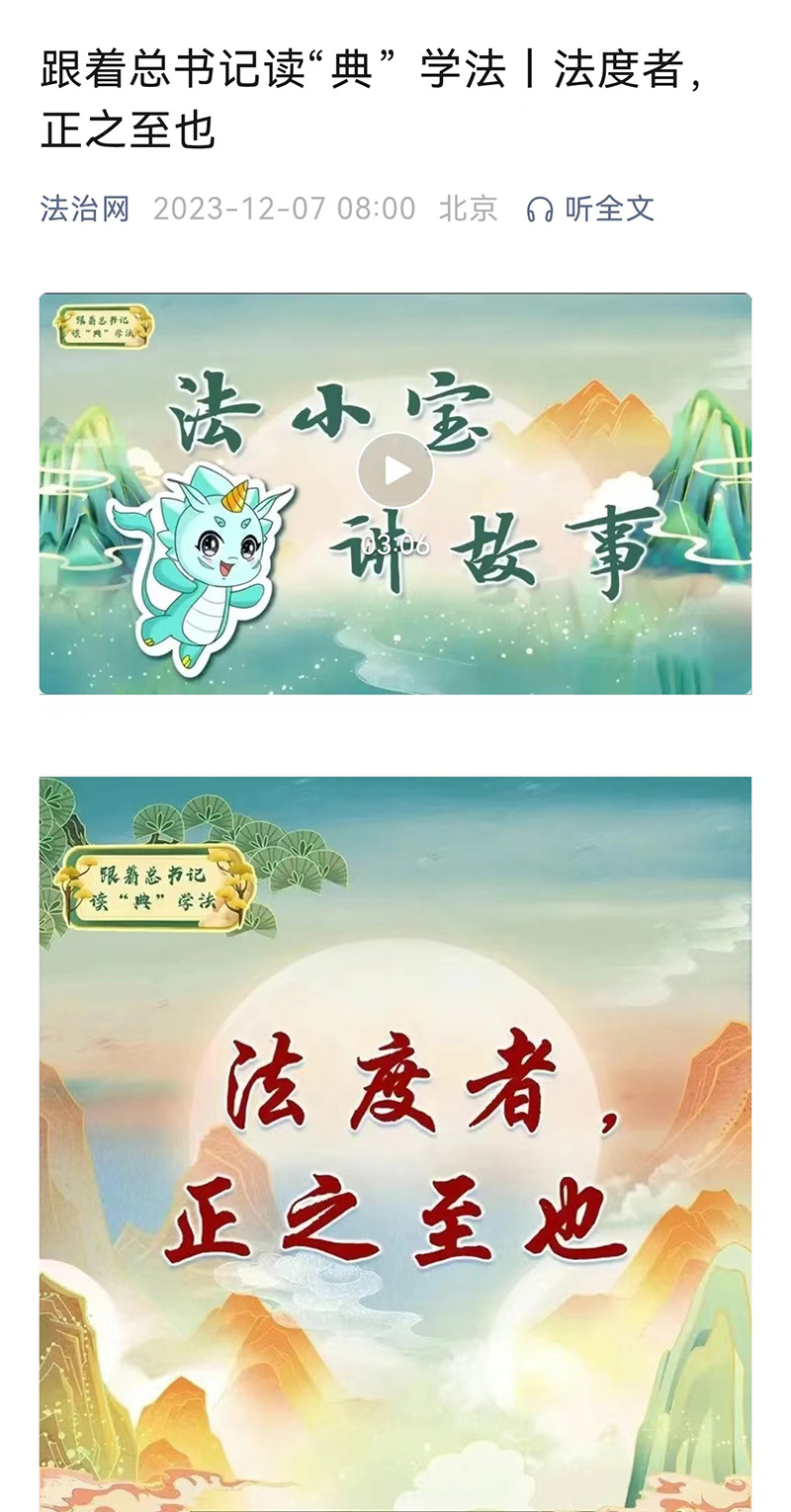 為進(jìn)一步強(qiáng)化習(xí)近平法治思想宣傳闡釋,對(duì)法治網(wǎng)“習(xí)近平法治思想”頻道進(jìn)行全面改版;繼續(xù)推出“跟著總書記讀‘典’學(xué)法”系列融媒體產(chǎn)品,深入宣傳習(xí)近平法治思想,傳承中華優(yōu)秀傳統(tǒng)法律文化;全年制作992期《法治金句》節(jié)目,被學(xué)習(xí)強(qiáng)國(guó)APP在首頁(yè)和“法治中國(guó)”“聽法律”兩個(gè)頻道同步推送。