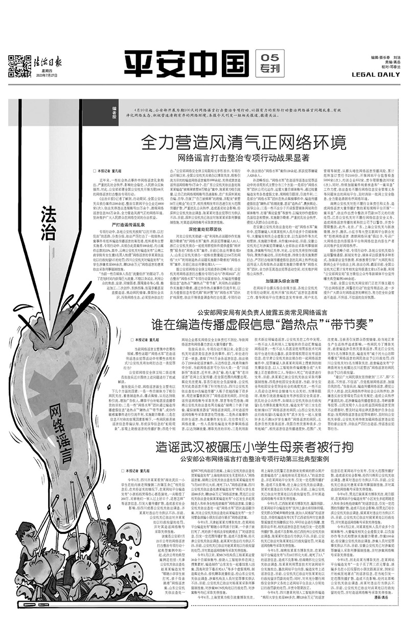 充分發(fā)揮平安中國(guó)??瘍?yōu)勢(shì),集中報(bào)道政法機(jī)關(guān)在保護(hù)青少年、守護(hù)綠水青山、整治網(wǎng)絡(luò)亂象、基層社會(huì)治理創(chuàng)新、嚴(yán)厲打擊各類違法犯罪活動(dòng)方面所作的積極努力