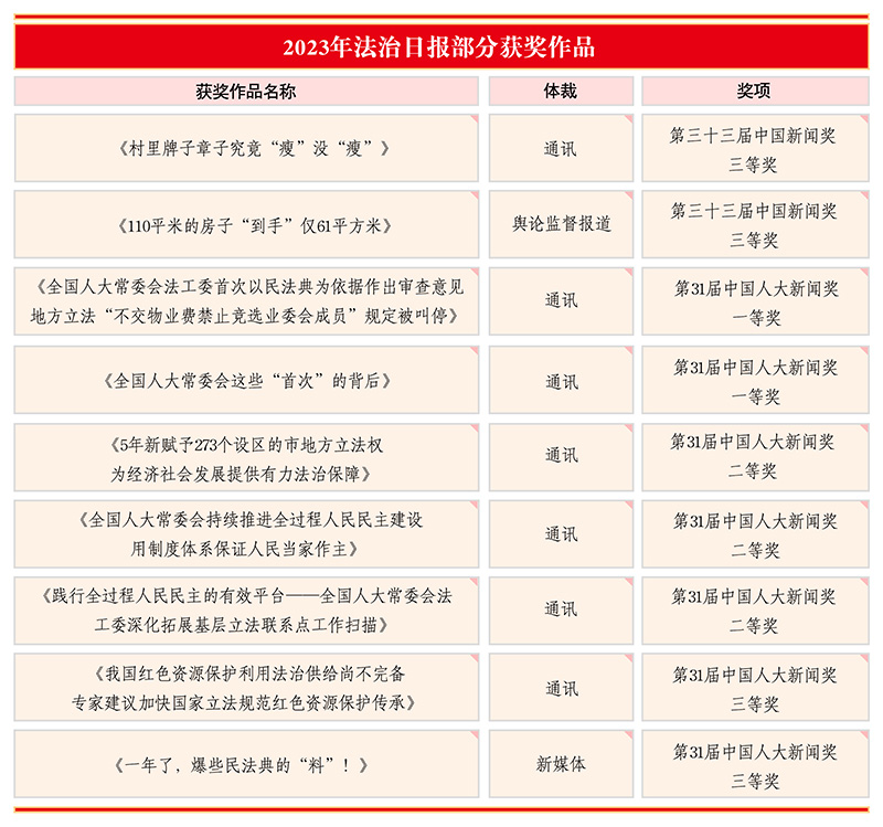 2023年,報(bào)社2件作品獲得第三十三屆中國(guó)新聞獎(jiǎng)三等獎(jiǎng),7件作品分獲第31屆中國(guó)人大新聞獎(jiǎng)一、二、三等獎(jiǎng),1個(gè)專題獲評(píng)“2023中國(guó)正能量網(wǎng)絡(luò)精品”,1件作品獲得第十八屆全國(guó)法治動(dòng)漫微視頻作品征集活動(dòng)三等獎(jiǎng);3個(gè)黨支部被中央和國(guó)家機(jī)關(guān)工委評(píng)為“四強(qiáng)”黨支部。