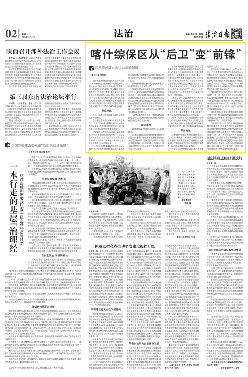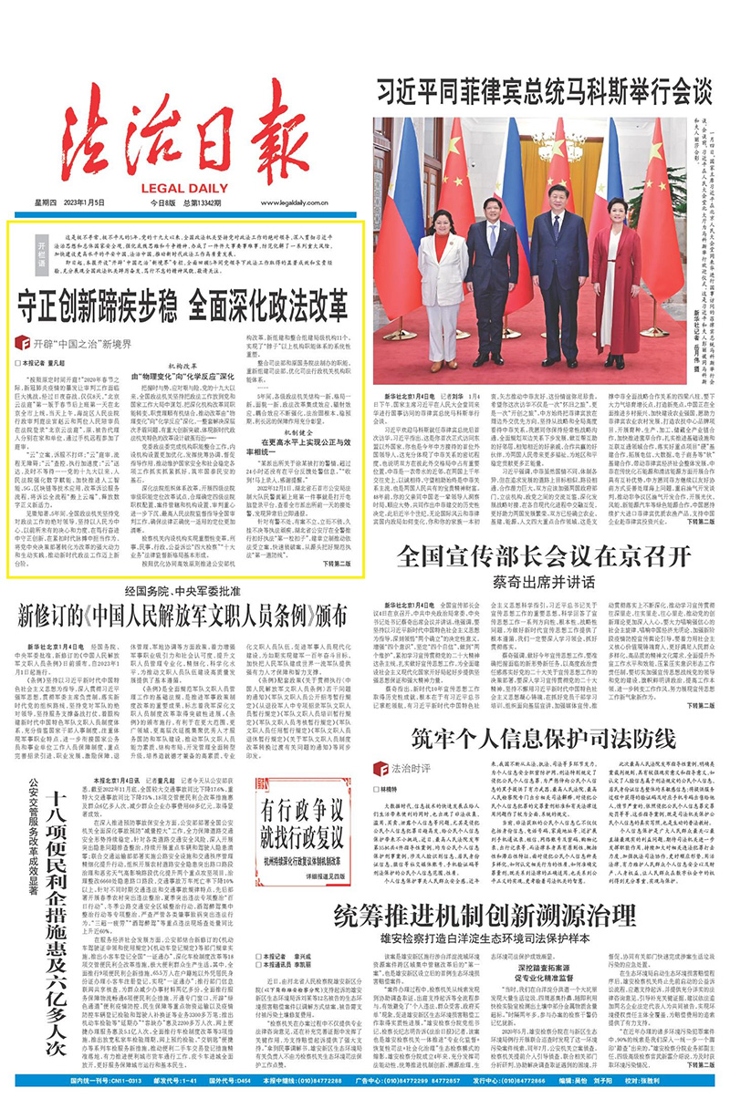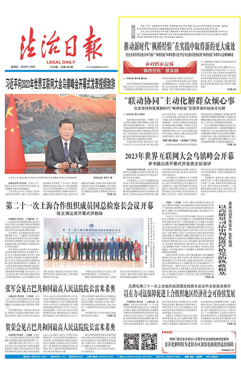 2023年11月9日,“新時(shí)代新征程·‘楓橋經(jīng)驗(yàn)’新實(shí)踐”專欄在《法治日?qǐng)?bào)》1版開欄,共推出4篇專家解讀、6篇省級(jí)政法委書記署名文章和50余篇“楓橋式工作法”先進(jìn)單位事跡稿件