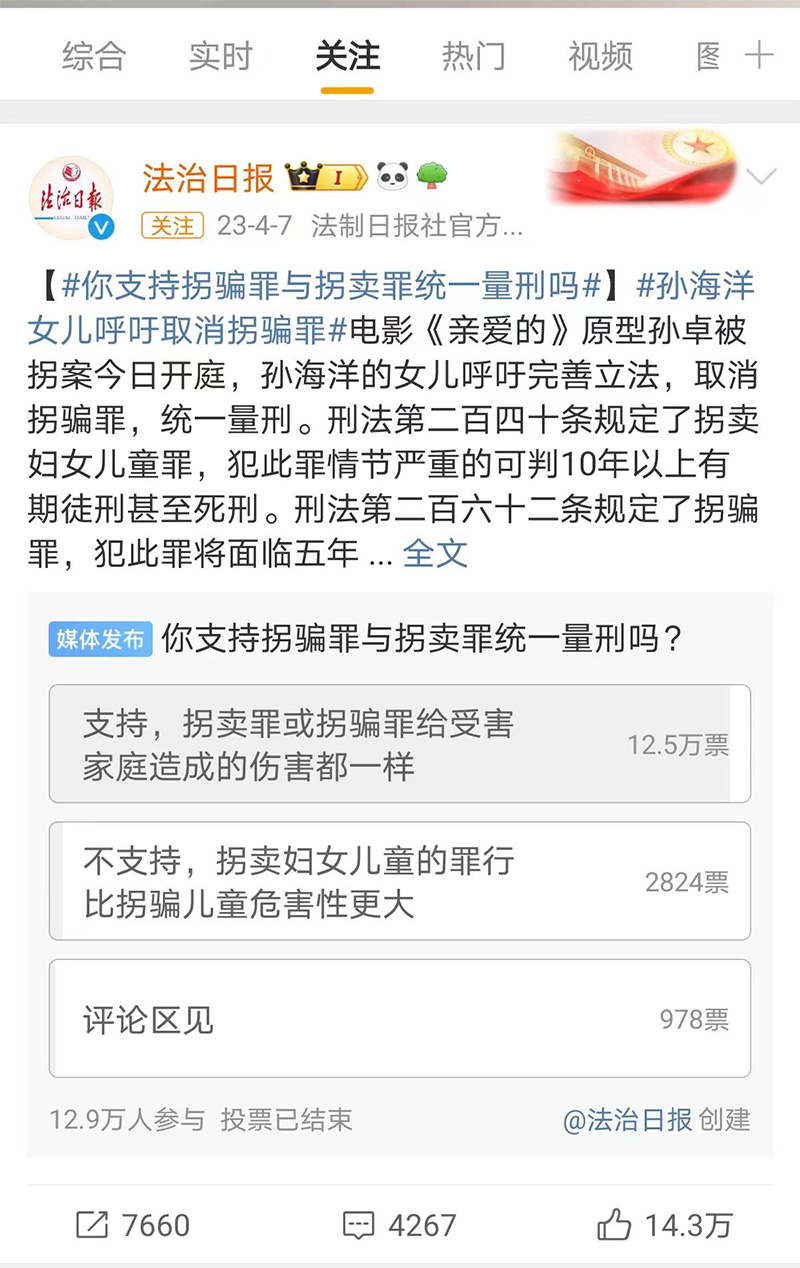 關(guān)注孫卓被拐案,推出微博話題#你支持拐騙罪與拐賣罪統(tǒng)一量刑嗎#并發(fā)起投票,普及兩種罪名區(qū)別,引導(dǎo)網(wǎng)友理性參與討論。本次投票活動(dòng)被新浪評(píng)為兼具專業(yè)性與話題度的優(yōu)質(zhì)投票,列入優(yōu)質(zhì)投票案例在微博平臺(tái)展示