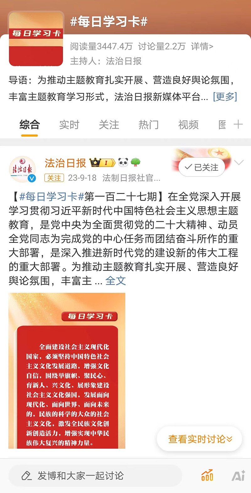 為豐富主題教育形式,法治日?qǐng)?bào)微博開設(shè)#每日學(xué)習(xí)卡#原創(chuàng)話題,以圖卡形式陸續(xù)推送《習(xí)近平著作選讀》《習(xí)近平新時(shí)代中國(guó)特色社會(huì)主義思想專題摘編》等著作中的重要論述。自2023年5月中旬至9月底共推送138期內(nèi)容