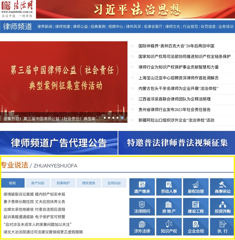 法治網(wǎng)“律師”頻道開設(shè)17個(gè)與大眾生產(chǎn)生活密切相關(guān)的欄目,邀請(qǐng)律師撰寫普法文章解答網(wǎng)友法律問題