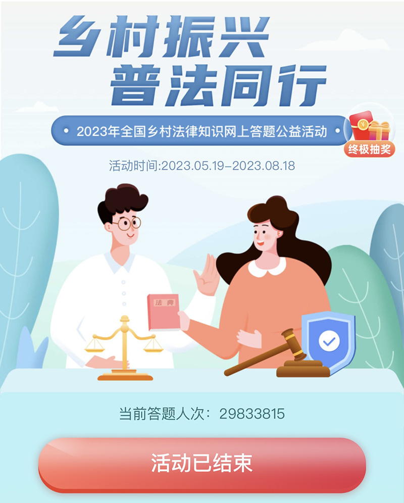 “鄉(xiāng)村振興·普法同行”全國(guó)鄉(xiāng)村法律知識(shí)網(wǎng)上答題公益活動(dòng)參與答題人次達(dá)到2983萬