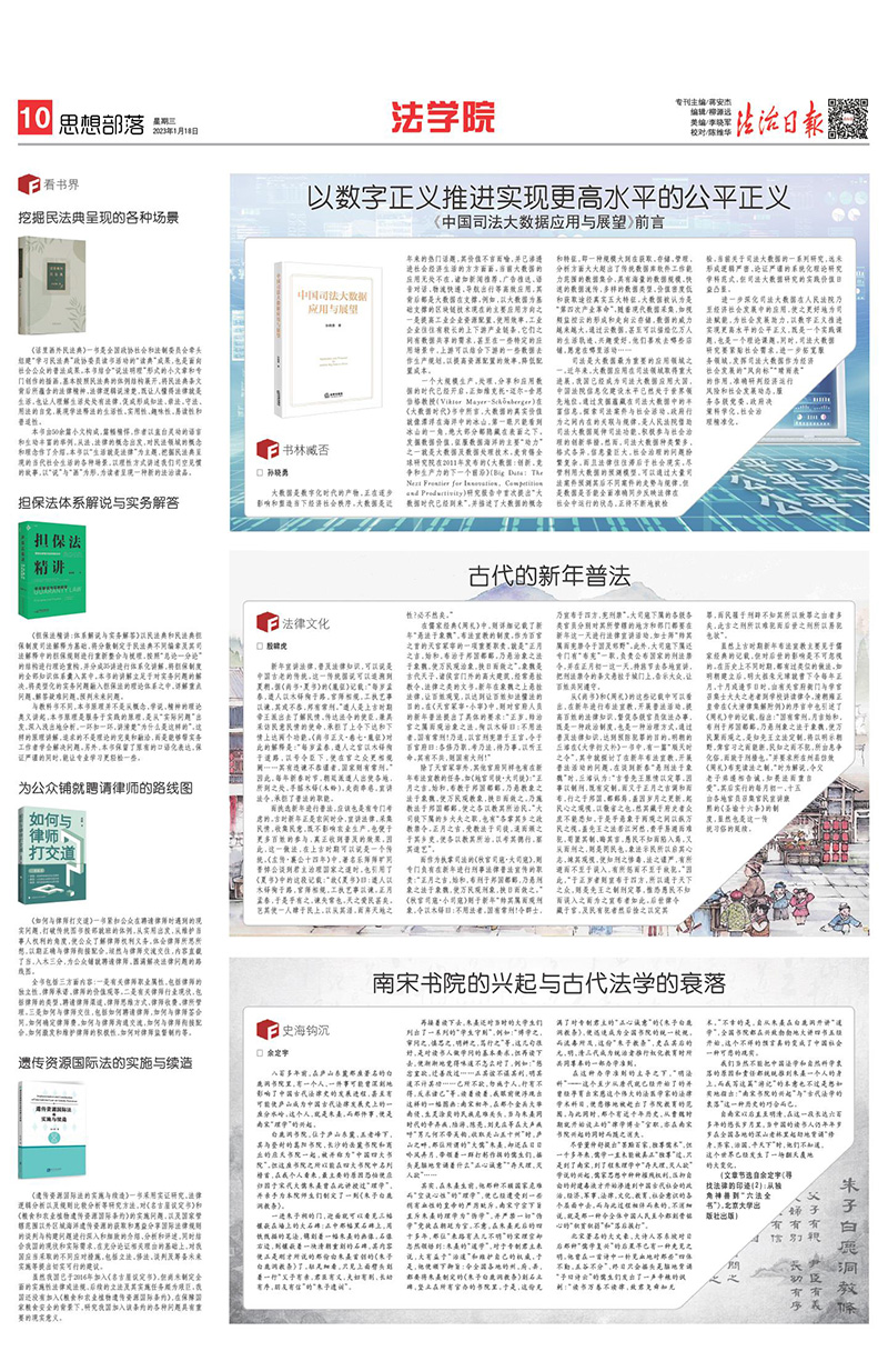 深耕法治文化,弘揚(yáng)法治精神。法學(xué)院??_設(shè)“法律文化”“史海鉤沉”“書林臧否”“畢業(yè)典禮致辭”等欄目,弘揚(yáng)中華優(yōu)秀傳統(tǒng)法律文化,介紹優(yōu)秀法治文化類圖書書評(píng)、書序,反映我國(guó)高校法學(xué)教育蒸蒸日上圖景?!斗ㄖ稳?qǐng)?bào)·社區(qū)版》“法治文化”版2023年刊發(fā)300余篇(幅)基層政法工作者創(chuàng)作的文藝作品,為基層文化建設(shè)提供展示平臺(tái)。