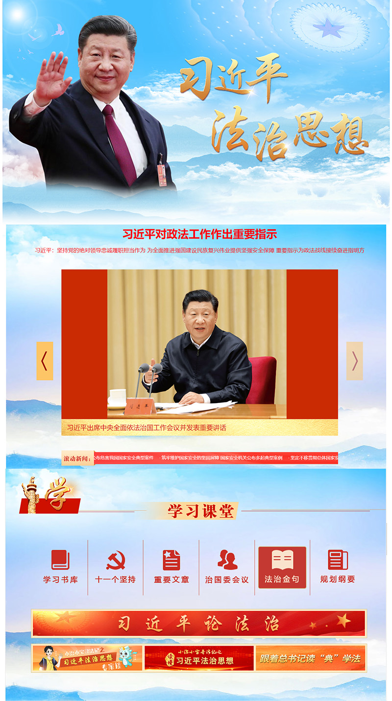 改版后的法治網(wǎng)“習(xí)近平法治思想”頻道,以學(xué)、思、踐、悟?yàn)橹骶€,共設(shè)置頭條專區(qū)、學(xué)習(xí)專區(qū)、權(quán)威解讀、法治實(shí)踐、學(xué)習(xí)筆談、融媒視野六大版塊,全力打造習(xí)近平法治思想網(wǎng)上宣傳陣地