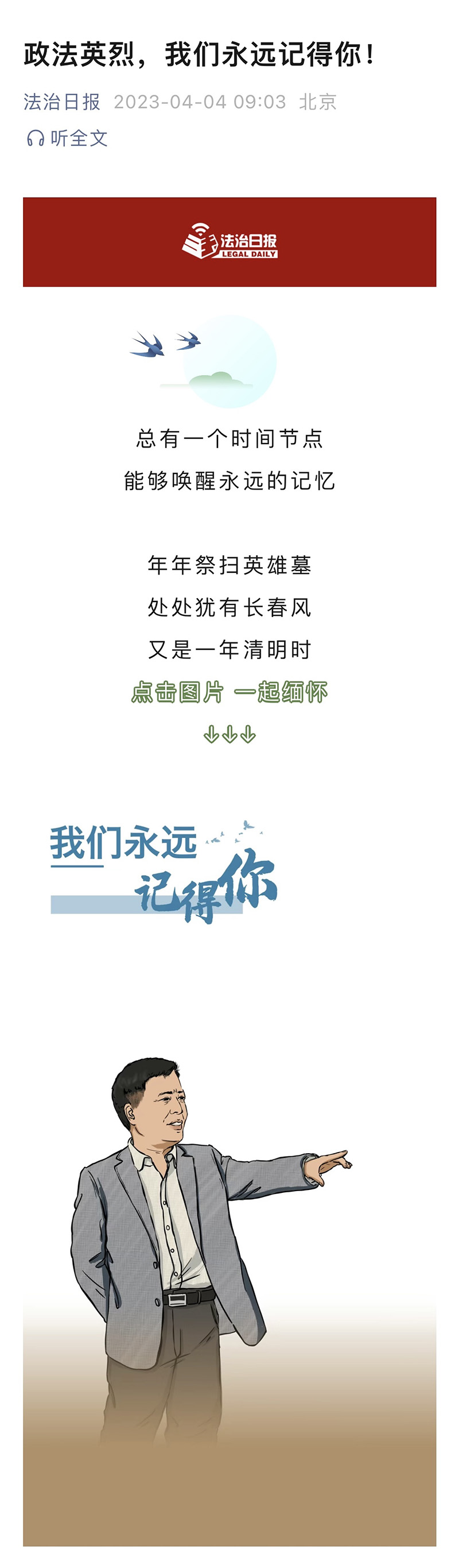 法治日?qǐng)?bào)微信公眾號(hào)2023年4月4日稿件《政法英烈,我們永遠(yuǎn)記得你!》,采用“手繪圖片+疊加反轉(zhuǎn)”形式效果,只要“點(diǎn)亮”英烈照片,英烈音容笑貌和生前事跡立即躍然眼前,生動(dòng)又富有感染力,取得良好宣傳效果