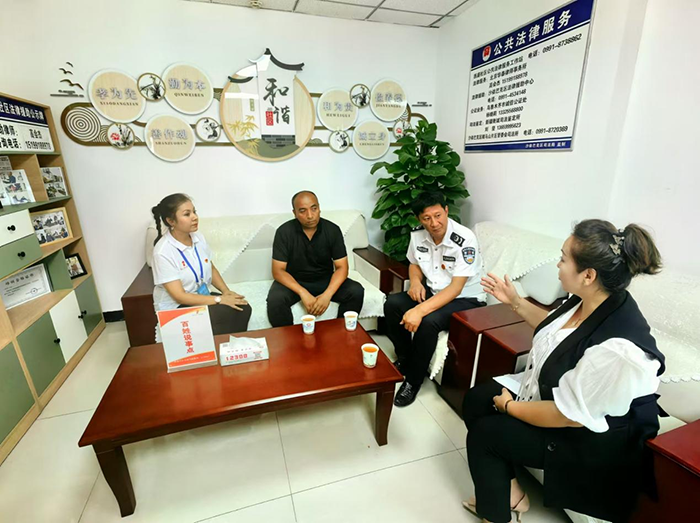 8月24日下午,在烏魯木齊市沙依巴克區(qū)騎馬山街道西盛社區(qū)“百姓說事點”,街道司法所專職人民調(diào)解員楊新團(tuán)(右二)和社區(qū)人民調(diào)解員熱西旦·那斯?fàn)枺ㄗ笠唬┏晒φ{(diào)解一起鄰里之間因噪聲污染引發(fā)的矛盾糾紛。法治日報全媒體記者 潘從武 攝
