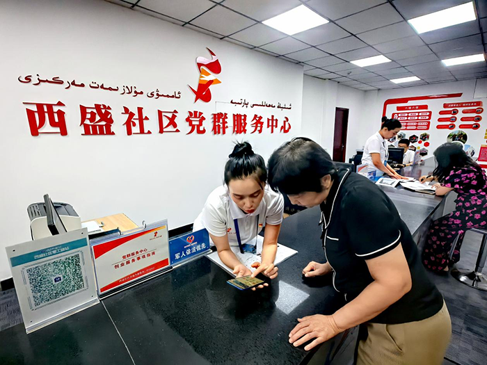 8月24日,烏魯木齊市沙依巴克區(qū)騎馬山街道西盛社區(qū)工作人員正在向轄區(qū)居民介紹“百姓說事云·書記直通車”線上平臺的使用方法。法治日報全媒體記者 潘從武 攝