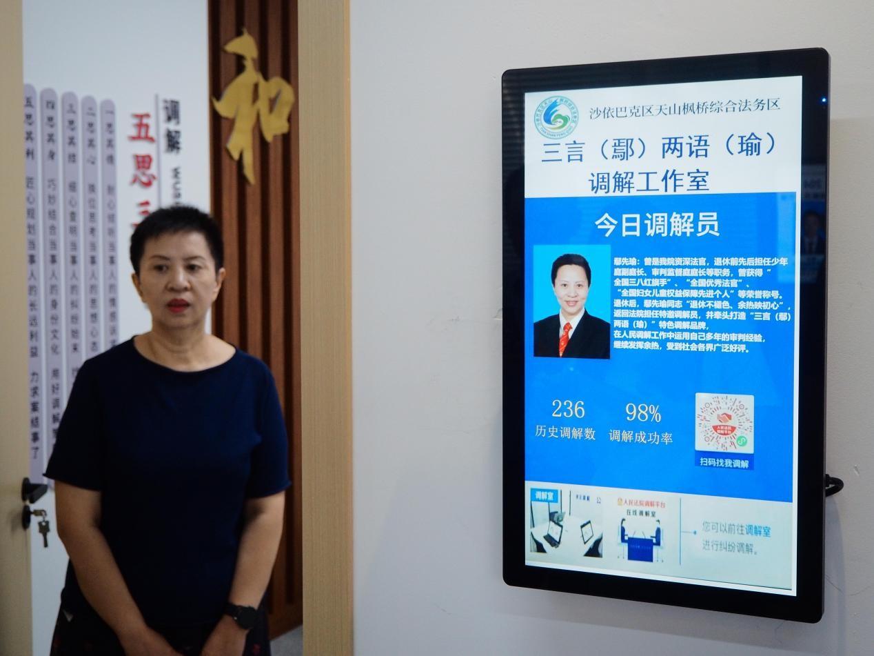 在新疆烏魯木齊市沙依巴克區(qū)“天山楓橋”綜合法務(wù)區(qū),有一個“三言(鄢)兩語(瑜)調(diào)解工作室”,鄢先瑜就在這里,完成了數(shù)百件婚姻家事案件的訴前調(diào)解。
