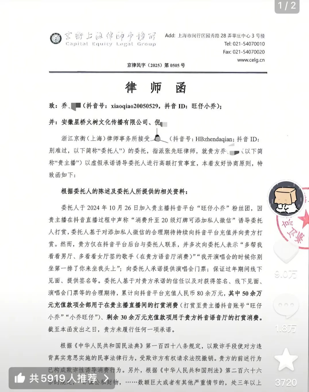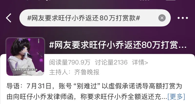 話題#網(wǎng)友要求旺仔小喬返還80萬打賞款#引發(fā)熱議。