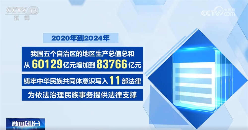 相關(guān)負(fù)責(zé)人表示,2020年到2024年,我國(guó)五個(gè)自治區(qū)的地區(qū)生產(chǎn)總值總和從60129億元增加到83766億元。鑄牢中華民族共同體意識(shí)寫入11部法律,為依法治理民族事務(wù)提供法律支撐。