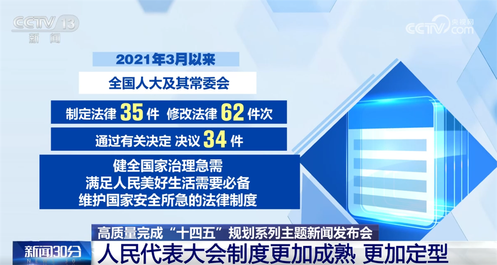 2021年3月以來,全國(guó)人大及其常委會(huì)制定法律35件、修改法律62件次,通過有關(guān)決定、決議34件,健全國(guó)家治理急需、滿足人民美好生活需要必備、維護(hù)國(guó)家安全所急的法律制度。