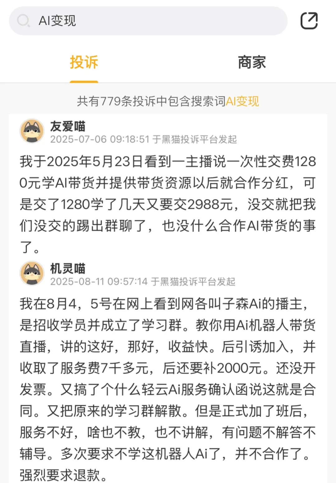 在黑貓投訴平臺上,有關(guān)“AI變現(xiàn)”的投訴已達(dá)700多條。不少投訴者提到,購買課程后不僅沒學(xué)到實(shí)質(zhì)內(nèi)容,還被商家誘導(dǎo)二次消費(fèi),一旦拒絕二次消費(fèi),就會被直接踢出交流群。