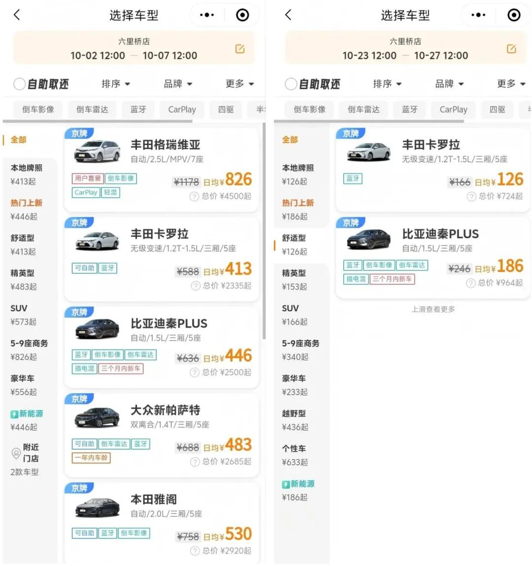 ▲某租車平臺國慶期間和節(jié)后租車價格對比。