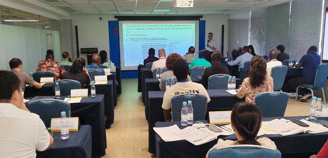 陳文彬院長通過全英文的沉浸式教學(xué),系統(tǒng)闡述了習(xí)近平法治思想的原創(chuàng)性貢獻,并對其核心要義和科學(xué)方法作了深入分析和講述,課程內(nèi)容深刻而豐富,授課過程中,突出案例式和研討式教學(xué)。學(xué)員積極參與互動,熱情度極高,圍繞法治和人治的比較,中國的法治建設(shè)和降低犯罪率、貧困率之間的關(guān)系,如何讓普通人對法律建立真誠信仰,領(lǐng)導(dǎo)人如何了解人民的意愿,以及如何從“5個體系”推動法治建設(shè)等展開交流,陳文彬院長用流利的英語為學(xué)員答疑解惑,平等的對話和坦誠的交流讓學(xué)員進一步加深了對中國法治理念的認同。