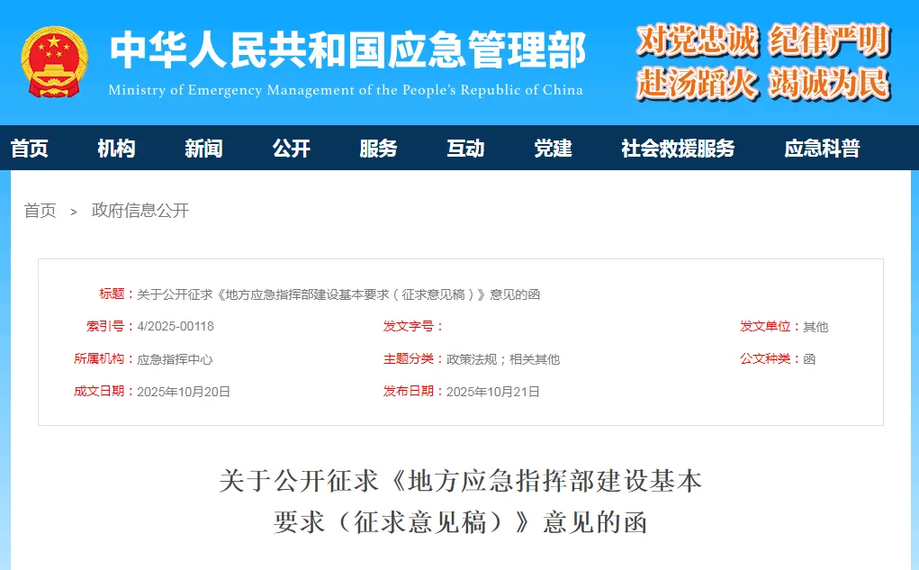 根據(jù)應(yīng)急管理部標(biāo)準(zhǔn)制修訂計(jì)劃安排,應(yīng)急管理部應(yīng)急指揮中心組織起草了《地方應(yīng)急指揮部建設(shè)基本要求(征求意見稿)》和編制說明(見附件1-2),現(xiàn)向社會(huì)公開征求意見。反饋意見請?zhí)顚憽稇?yīng)急管理標(biāo)準(zhǔn)項(xiàng)目征求意見表》(見附件3),并于2025年11月23日之前發(fā)送至電子郵箱591724758@qq.com。