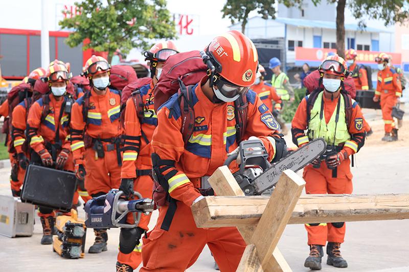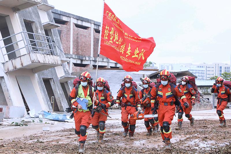 圖為模擬居民自建房與民族村寨發(fā)生火災(zāi)、山體滑坡導致“斷水、斷電、斷路”等突發(fā)險情,多方救援力量迅速開展協(xié)同救援行動