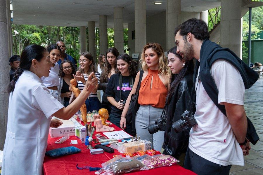 2025年4月15日,在巴西里約熱內(nèi)盧天主教大學(xué)舉辦的“國際中文日”慶?;顒由希瑢W(xué)生們觀看中醫(yī)療法展示。新華社記者 王天聰 攝