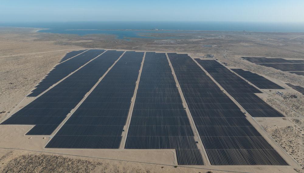 這是2025年4月2日在墨西哥佩尼亞斯科港附近拍攝的中國能源建設(shè)集團(tuán)承建的佩尼亞斯科港光伏項目二期工程(無人機照片)。新華社記者 李夢馨 攝