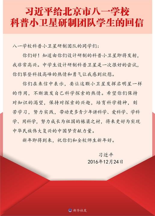 三個(gè)多月后,同學(xué)們給習(xí)近平總書(shū)記寫(xiě)信,報(bào)告小衛(wèi)星即將發(fā)射的消息,很快收到了總書(shū)記的回信。習(xí)近平總書(shū)記在回信中說(shuō),“你們攀登科技高峰的熱情和勇氣讓我感到欣慰”“希望你們保持對(duì)知識(shí)的渴望,保持對(duì)探索的興趣,培育科學(xué)精神,刻苦學(xué)習(xí),努力實(shí)踐,帶動(dòng)更多青少年講科學(xué)、愛(ài)科學(xué)、學(xué)科學(xué)、用科學(xué),努力成長(zhǎng)為祖國(guó)的棟梁之材”。