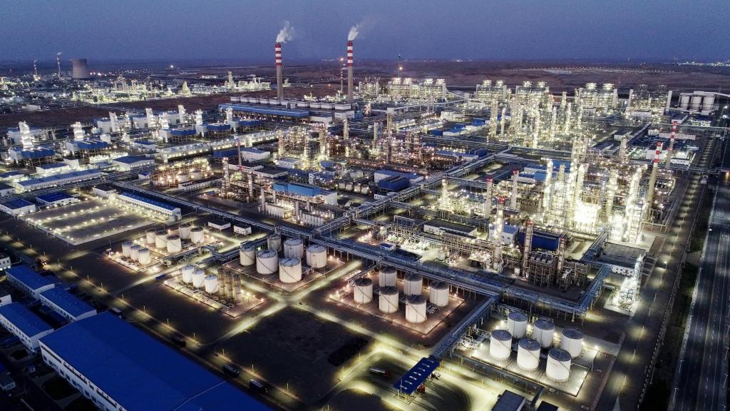 這是國家能源集團(tuán)寧夏煤業(yè)公司400萬噸煤制油項(xiàng)目夜景(2022年6月22日,無人機(jī)照片)。新華社記者 王鵬 攝