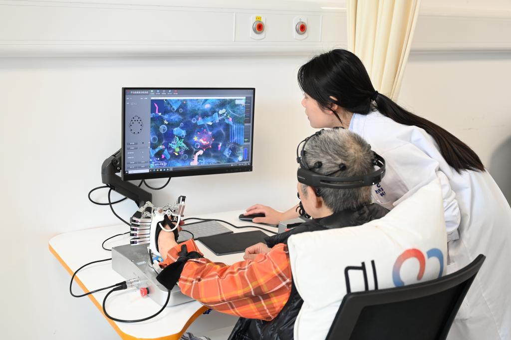 重慶市第五人民醫(yī)院的腦機(jī)接口康復(fù)治療室里,因腦卒中上肢癱瘓的老吳頭戴非侵入式腦機(jī)接口裝置,左手在外骨骼機(jī)械手臂輔助下完成伸展、合攏……