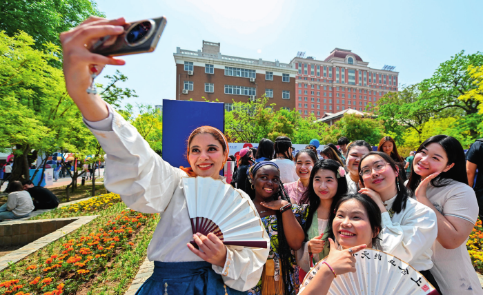 中外青年在以“上合之約 天外同彩”為主題的天津外國語大學(xué)第八屆國際文化節(jié)上合影留念(2025年4月20日攝)孫凡越攝/本刊