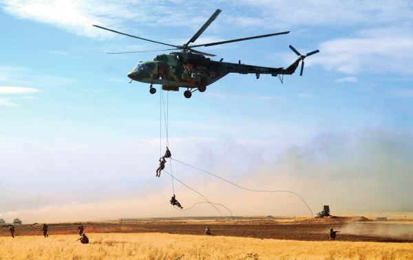 在俄羅斯奧倫堡州東古茲靶場舉行的“和平使命-2021”上海合作組織聯(lián)合反恐軍事演習(xí)實(shí)兵實(shí)彈演習(xí)中,多國聯(lián)合部隊(duì)特戰(zhàn)分隊(duì)執(zhí)行索降作戰(zhàn)任務(wù)(資料照片) 梅世雄攝/本刊