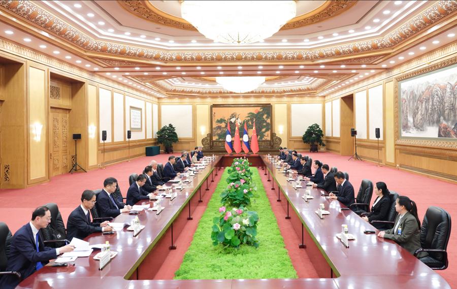 習(xí)近平強(qiáng)調(diào),當(dāng)前國(guó)際和地區(qū)形勢(shì)發(fā)生復(fù)雜深刻變化,雙方要以長(zhǎng)遠(yuǎn)眼光和戰(zhàn)略思維看待和把握中老關(guān)系,在涉及彼此核心利益和重大關(guān)切問(wèn)題上堅(jiān)定相互支持。要以明年兩國(guó)建交65周年為契機(jī),謀劃開(kāi)展好各領(lǐng)域交往。中方愿同老方深化治黨治國(guó)經(jīng)驗(yàn)交流,支持老撾人民革命黨籌備和開(kāi)好十二大。要以中老鐵路運(yùn)營(yíng)和沿線開(kāi)發(fā)為抓手,持續(xù)拓展“黃金大通道”輻射帶動(dòng)效應(yīng),推動(dòng)重點(diǎn)項(xiàng)目提質(zhì)升級(jí)。要深化防務(wù)、執(zhí)法安全等合作,對(duì)跨境賭博、電信網(wǎng)絡(luò)詐騙犯罪等持續(xù)高壓嚴(yán)打。中方祝賀老撾成為上海合作組織對(duì)話伙伴,愿同老方在中國(guó)東盟合作、瀾湄合作、東亞峰會(huì)等地區(qū)機(jī)制下深化協(xié)調(diào)和配合,促進(jìn)地區(qū)和平與發(fā)展。