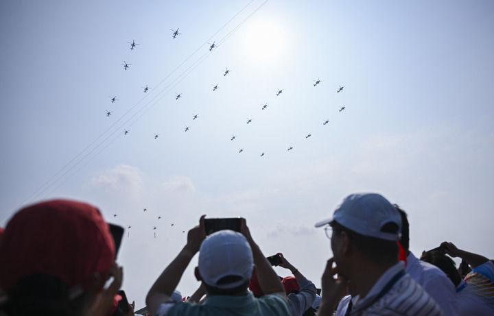 9月3日,習(xí)近平總書記同來(lái)自五大洲的外國(guó)友人并肩站立在天安門城樓上。26架直升機(jī)組成巨大的“80”字樣飛過(guò),眾人仰首凝望。