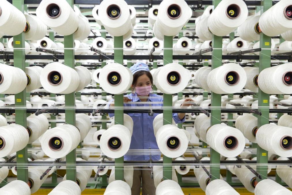 在中國平煤神馬集團(tuán)簾子布發(fā)展公司布機(jī)車間,工作人員在檢查絲線生產(chǎn)情況。新華社記者 李嘉南 攝
