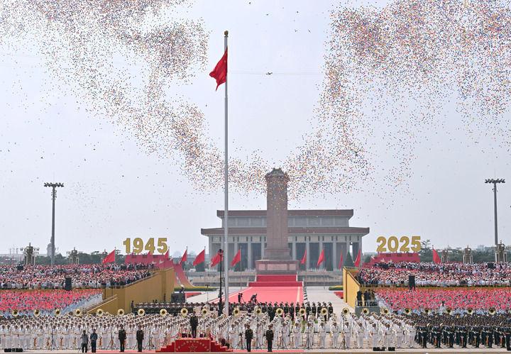 2025年9月3日,紀(jì)念中國人民抗日戰(zhàn)爭暨世界反法西斯戰(zhàn)爭勝利80周年大會在北京隆重舉行。這是紀(jì)念大會現(xiàn)場放飛氣球。新華社記者 李賀 攝