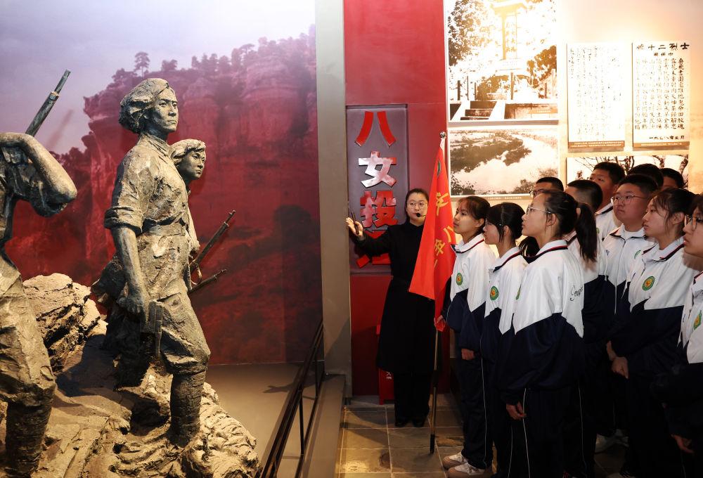 2025年4月3日,抗聯(lián)中學(xué)學(xué)生在東北抗聯(lián)史實(shí)陳列館聽講解員講述八女投江的故事。遼寧省本溪市本溪滿族自治縣抗聯(lián)中學(xué)與東北抗聯(lián)史實(shí)陳列館相距不足百米,每年都會開展東北抗聯(lián)精神教育活動,組織學(xué)生到陳列館,向抗聯(lián)英烈敬獻(xiàn)花籃,緬懷抗戰(zhàn)往事。近年來,為推動青少年更好地傳承紅色基因,遼寧積極推動抗聯(lián)精神融入大中小學(xué)思政課一體化建設(shè),編輯《中小學(xué)生抗聯(lián)史讀本》,圍繞“繼承抗聯(lián)傳統(tǒng)、學(xué)習(xí)抗聯(lián)精神”等主題舉辦表演、征文、競賽、夏令營和冬令營等活動。