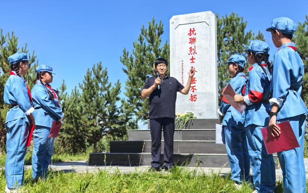2025年8月14日,參加“重走抗聯(lián)路”活動的學(xué)生在內(nèi)蒙古呼倫貝爾市阿榮旗六合鎮(zhèn)“紅軍崗”聆聽東北抗聯(lián)事跡介紹。1940年,東北抗聯(lián)第三路軍在此與日偽軍激戰(zhàn),多名戰(zhàn)士為保護(hù)村民壯烈犧牲。當(dāng)?shù)厝罕娒半U(xiǎn)將5位烈士遺體安葬于此,并立碑紀(jì)念。