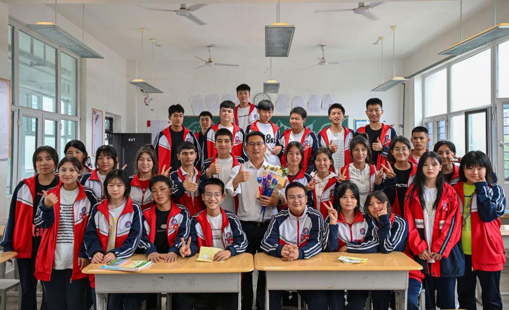 2024年9月10日,在新疆阿拉爾職業(yè)技術(shù)學(xué)校,援疆教師李斌傲(中)和23級(jí)電商班的學(xué)生合影?!?5后”年輕教師李斌傲是第十一批浙江臺(tái)州到新疆阿拉爾職業(yè)技術(shù)學(xué)校援疆教師中的一員,負(fù)責(zé)教授電子商務(wù)專業(yè)課程。他在學(xué)校主導(dǎo)籌建了電商實(shí)訓(xùn)室,還帶了4個(gè)新入職的教師當(dāng)徒弟?!芭嘤?xùn)好本地教師,就是打造一支帶不走的隊(duì)伍?!崩畋蟀琳f。