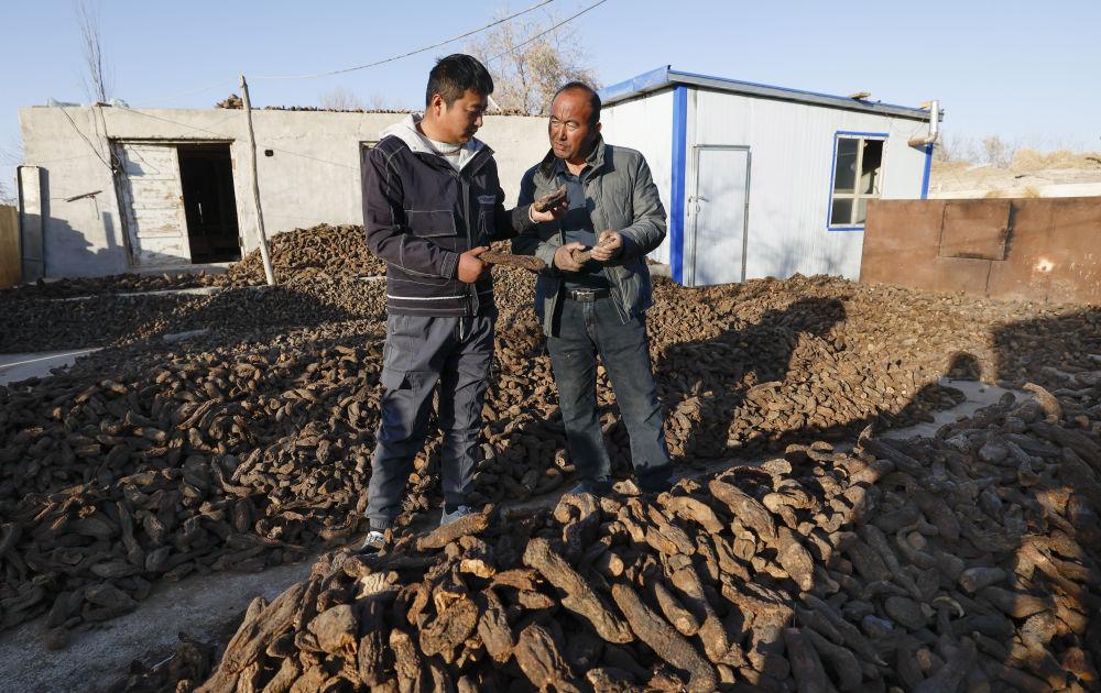 2024年12月4日,新疆民豐縣尼雅鎮(zhèn)甫甫克村村民麥麥提(右)同前來收購(gòu)大蕓的商戶交流。自20世紀(jì)末新疆全面開展防風(fēng)治沙工程并大力推進(jìn)沙產(chǎn)業(yè)以來,麥麥提從在合作社挖大蕓賺工錢,到后來主動(dòng)學(xué)習(xí)大蕓種植技術(shù)并創(chuàng)業(yè),一路走來小有收獲。2018年,他承包了10畝沙地種紅柳、大蕓。紅柳茁壯成長(zhǎng),大蕓產(chǎn)量頗豐,麥麥提年收入超過5萬元。