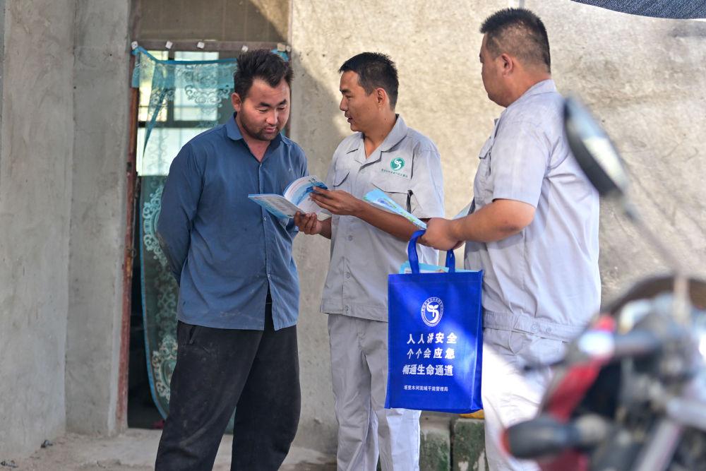 2024年8月13日,在新疆塔里木河尉犁段,新疆塔里木河流域干流管理局烏斯?jié)M管理站副站長(zhǎng)才登巴(中)與同事宋志偉入戶宣傳法律法規(guī)。